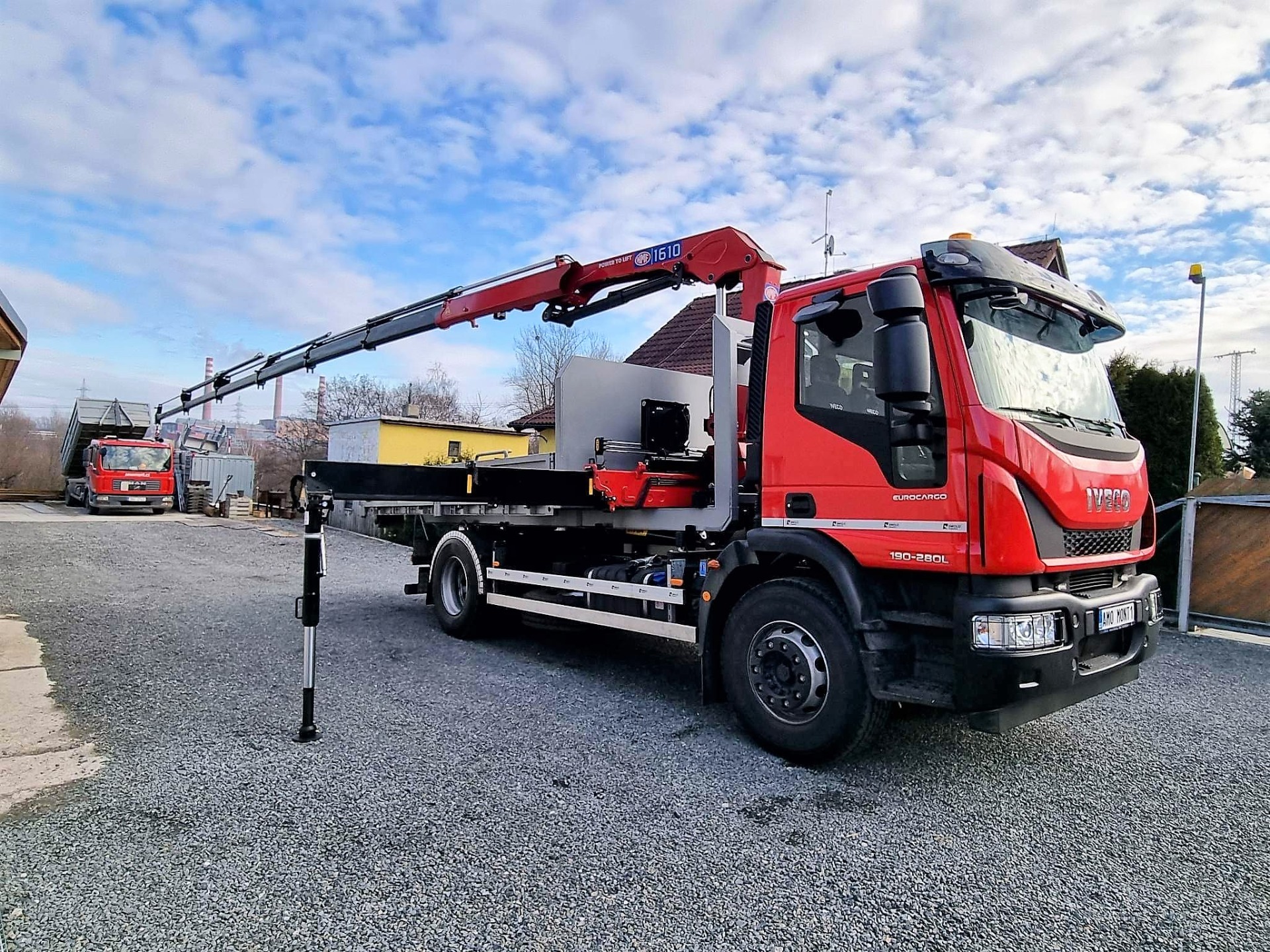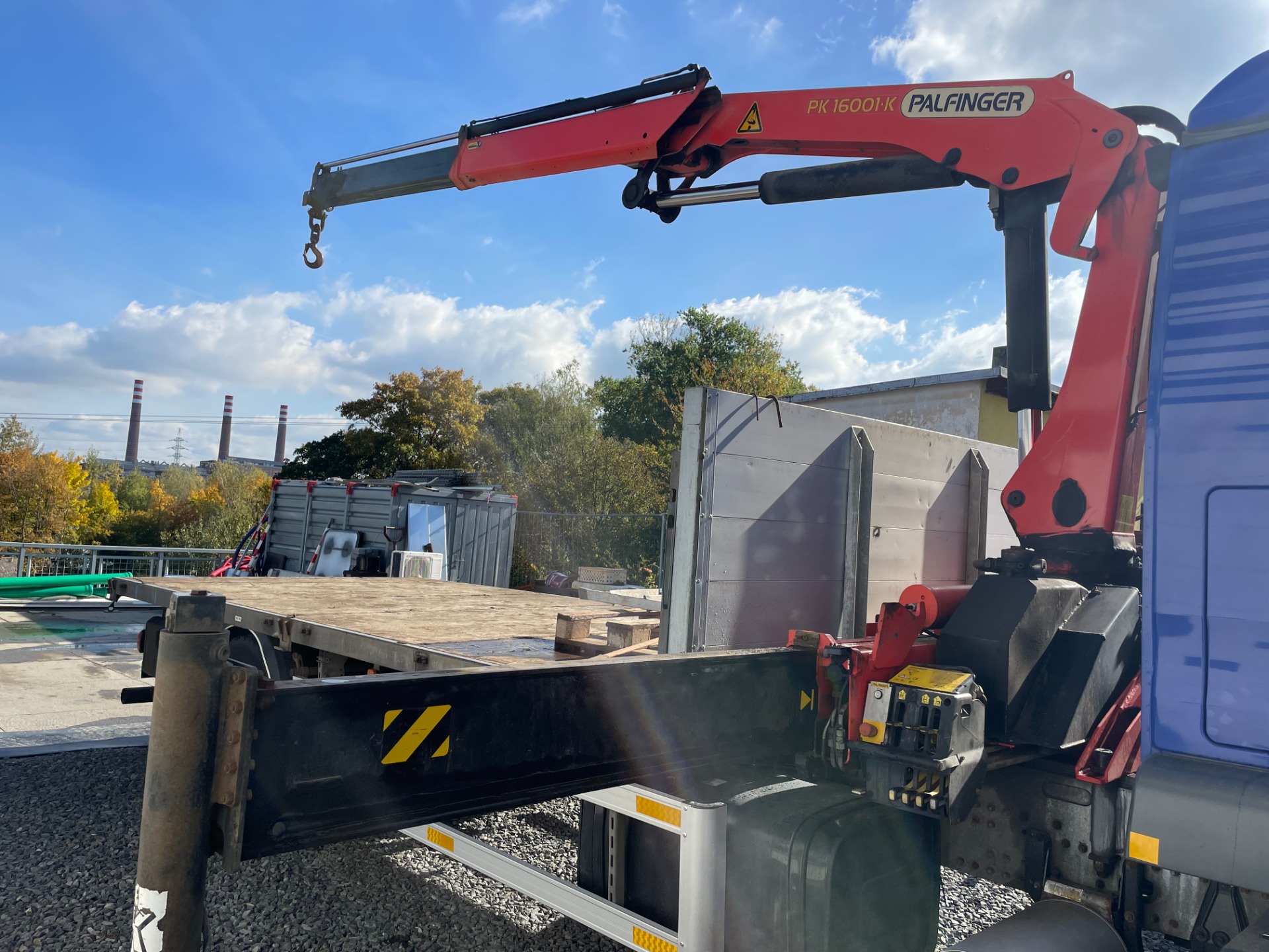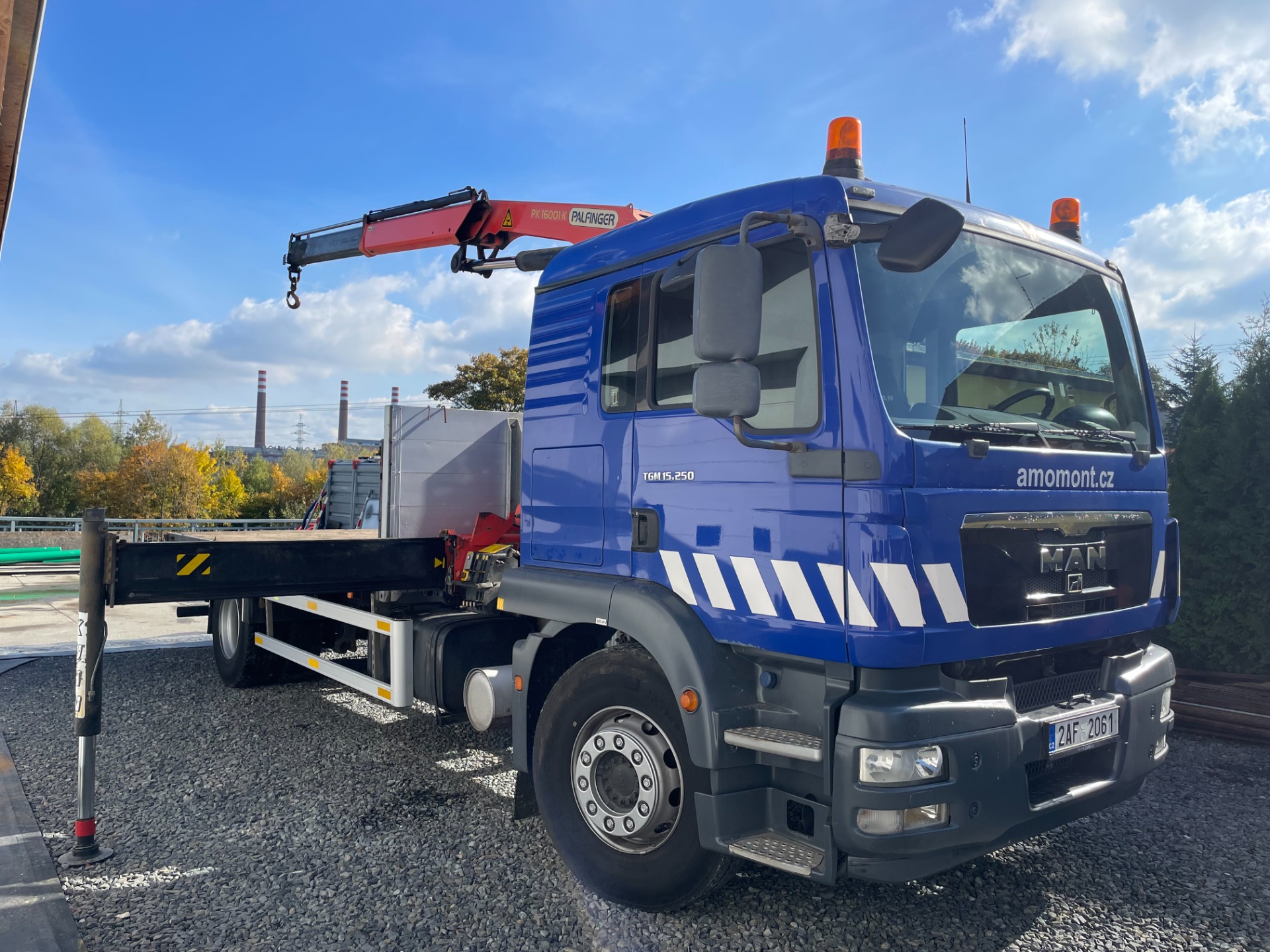 Ve vozovém parku naší společnosti je nákladní kontejnérové vozidlo MAN TGL o nosnosti 8 tun, s hydraulickým nakládacím jeřábem jenž při vyložení 13 m uzvedne 300 kg.