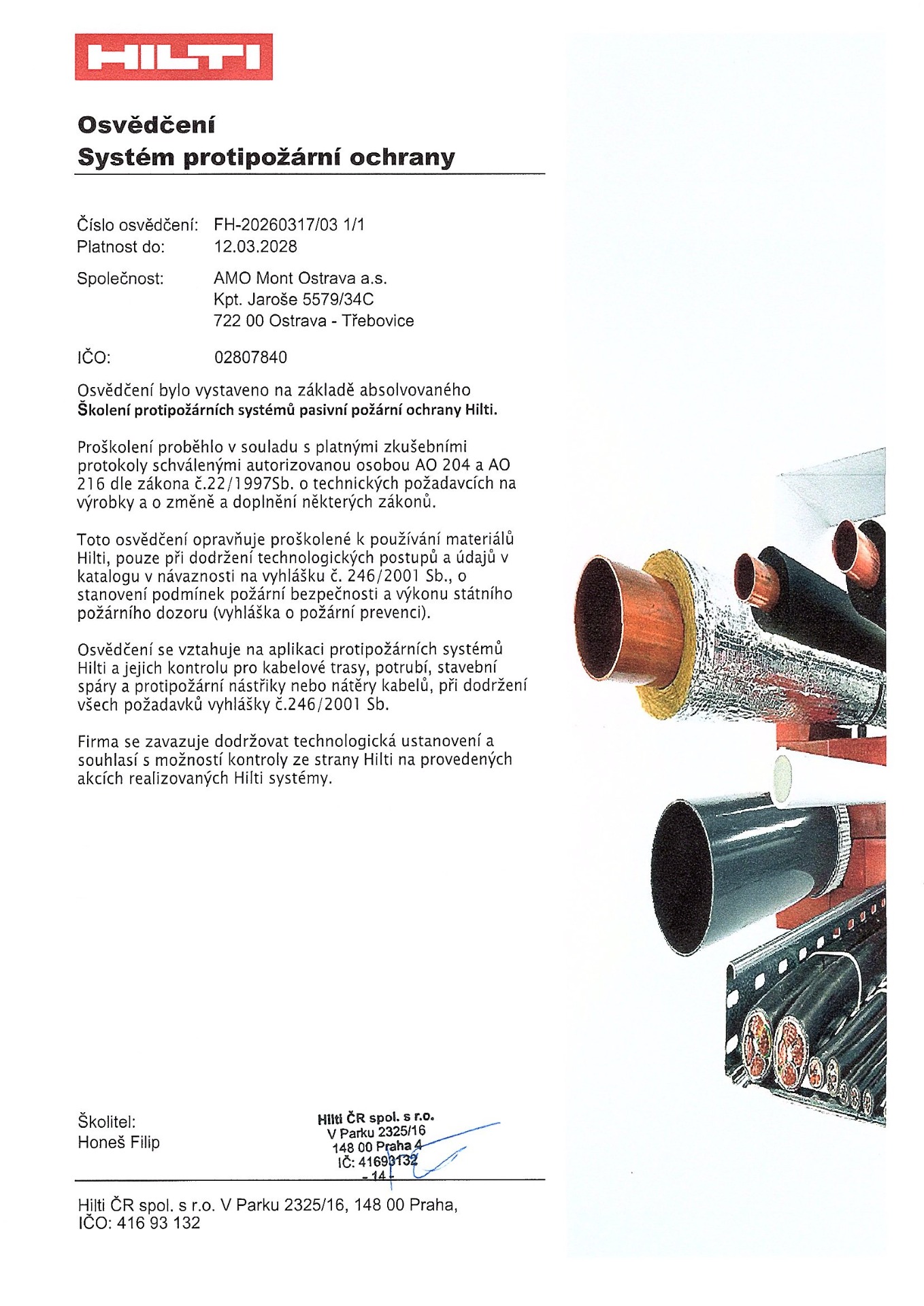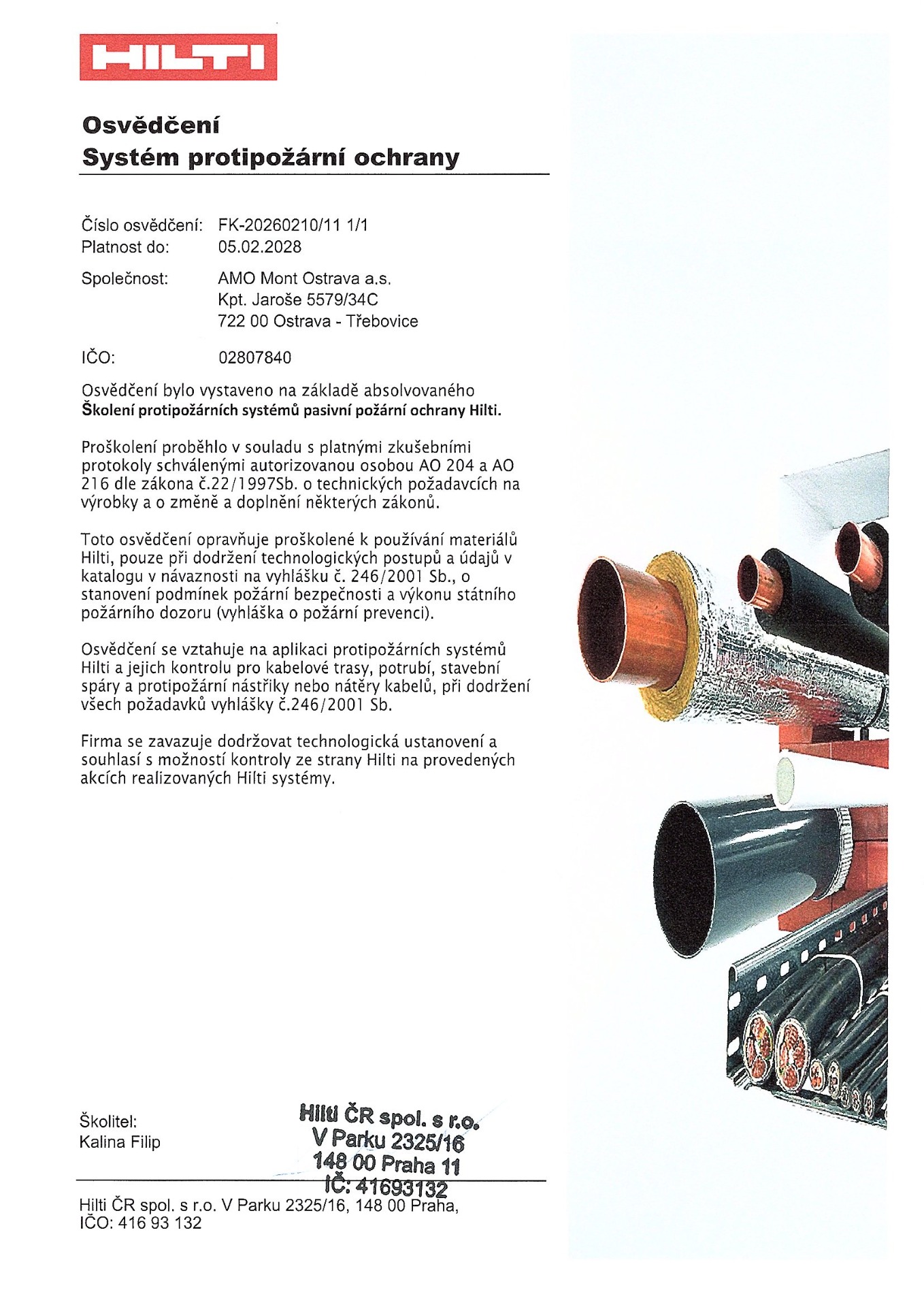 Osvědčení se vztahuje na aplikaci protipožárních systémů Hilti a jejich kontrolu pro kabelové trasy, potrubí, stavební spáry a protipožární nástřiky nebo nátěry kabelů, při dodržení všech požadavků vyhlášky č. 246/2001 Sb.